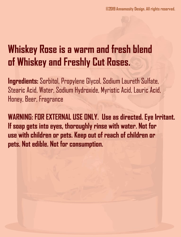 Whiskey Rose is a warm and fresh blend of Whiskey and Freshly Cut Roses. The Soap used is Honey Ale. Honey Ale gives the most elegant and lush lather. Even the beer helps to fight acne. (Each bar is roughly 3.5 x 2.5 × .75 inches and are neatly wrapped.) Human tested. Whiskey and Freshly Cut Rose scent blend.
